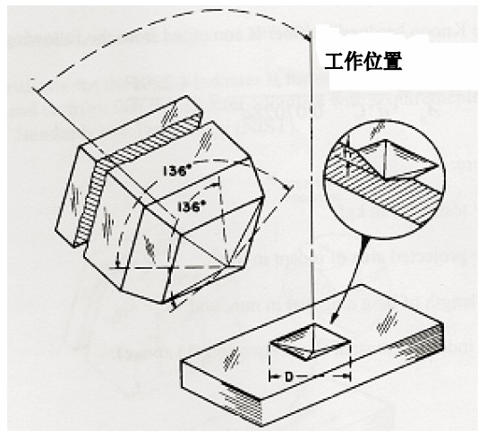 努氏金刚石压头的几何形状是菱形,其纵向内角是172度30分、横向内角是130°。由于这个几何特性,在试验力较小时也能测得较高精度的对角线。另外,努氏压痕的深度很浅,约为长对角线的1/30。由于这个特性,努氏硬度计很适用于薄的涂层、表面硬化层、薄的金属、金属薄片、脱碳层和硬的易碎金属等的硬度。维氏压头是面角136°的正四棱锥金刚石压头,可用来测试那些不适宜用努氏压头进行测量的材料。但是,由于压痕深度比较深,维氏硬度计不能像努氏硬度计一样,适宜测试很薄的金属薄片。